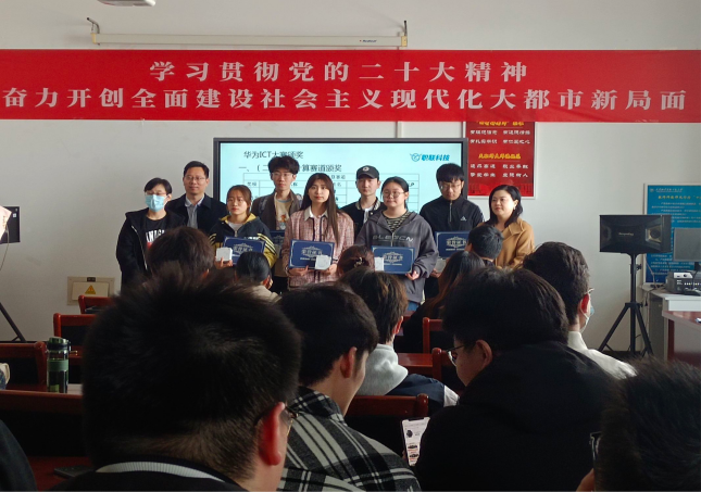 会议伊始,由华为公司天津区域HELP职联科技(天津)有限公司牵头,邀请了华为技术有限公司天津政企合作伙伴发展与管理部总监崔萍萍为2022-2023年度华为ICT大赛天津市赛获奖的同学和指导老师进行颁奖,学院科研副院长武志峰、党委副书记王蕾参与了此次颁奖。在本次比赛中,金沙官网学子在云计算赛道和计算赛道分别斩获天津市赛本科组一等奖1项,二等奖3项。信息工程学院参赛队将代表天津区域参加华为ICT大赛云计算赛道全国总决赛的角逐。同时,为激发同学们参赛热情,公司相关负责人对华为ICT大赛进行了详细的解读,据悉华为ICT大赛自2020年入选全国普通高校大学生竞赛排行榜内竞赛项目名单以来已成为中国高等教育学会认可的含金量高、参赛价值大的国家级竞赛项目之一,鼓励同学们积极参与赛事,通过以赛促学、以赛促练,开拓同学们的视野,提高自身的技能水平,服务区域ICT产业的发展。