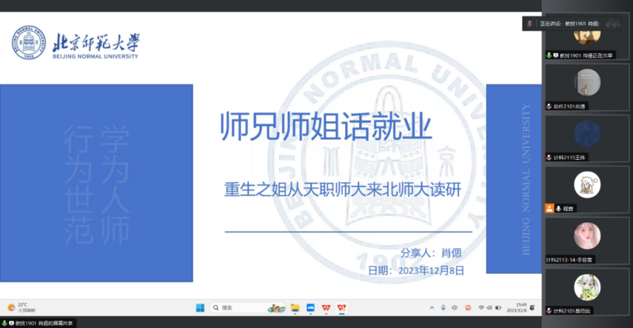 肖偲通过线上方式介绍了自己备考研究生的历程,如就何择校选专业进行经验分享,她深入地介绍了当时就业和升学之间的艰难抉择,指出所有的幸运都是因为长久的大学生活积累,随后分享了丰富的研究生校园生活,鼓励学弟学妹们勇往直前、一战成“硕”。
