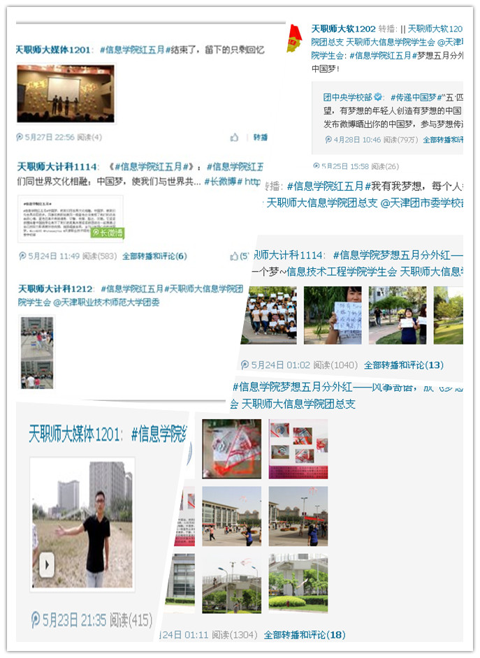 此外,本次活动在腾讯微博上掀起了#信息学院红五月#微话题讨论,并在6165cc金沙总站检测中心主页上创建“6165cc金沙总站检测中心‘梦想五月分外红’系列活动火热进行中”动态滚动栏,以扩大本次活动的宣传与影响力度。