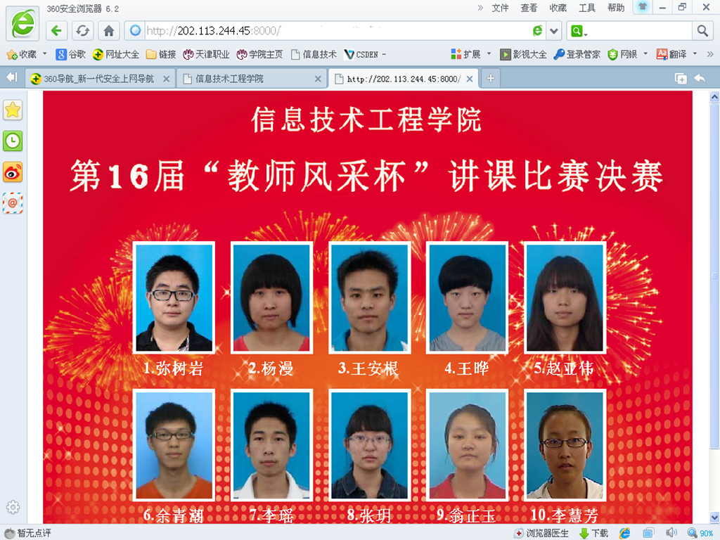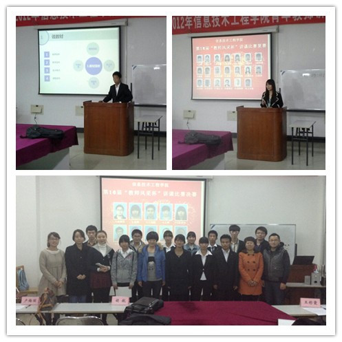 经过严格的层层筛选,最终根据教师评委得分,教技1202班李瑶斩获本届比赛桂冠,教技1202班张玥、王安根荣获比赛二等奖,教技1101班李慧芳、软件1302班王晔、计科1113班余青潮荣获比赛三等奖。根据大众评委得分,评选出“最佳风采奖”两名。