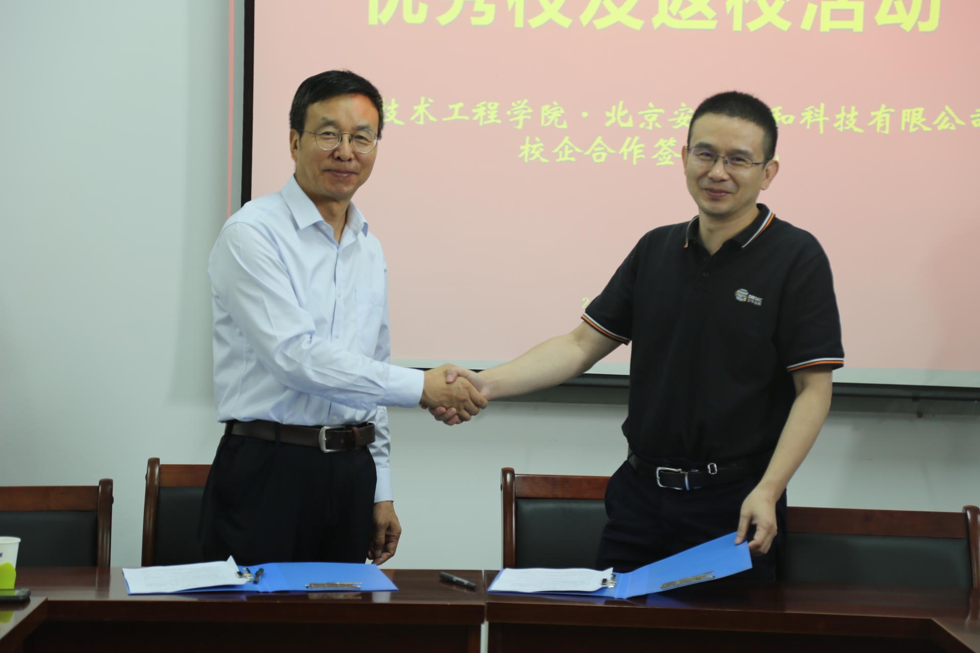 而后双方在合作意向书上签字,正式开起了双方产教融合和校企合作。签约仪式后,安华金和公司相关负责人员同网络工程系的部分教师针对大数据专业建设、网络安全、数据加密、课程建设等多个方面进行了深入的交流,共谋双方进一步的全方位合作思路,为双方实现共赢发展打下坚实的基础。