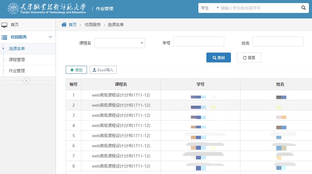 “作业提交系统”也是龚良波老师在防疫期间考虑到即将进行线上授课、提交作业、批改作业时所面临的问题而开发的系统,该系统具有签到、下载学习资料、提交作业、教师布置作业、上传附件、查看提交人员、控制提交作业事件、批改作业等功能。该系统可以自主创建任何课程,导入选课名单,同时可以和综合教务系统进行有效对接,方便教师进行作业布置和作业批改。“作业提交系统”采用.net core和vue等开发技术, 学生可以使用手机和电脑等设备登录系统,进行签到、作业提交和下载学习资料等操作。目前该系统在龚良波老师的上课班级已经推广使用,相比较于QQ、微信而言,该系统更加规范、整洁,学生提交作业时能够一目了然。