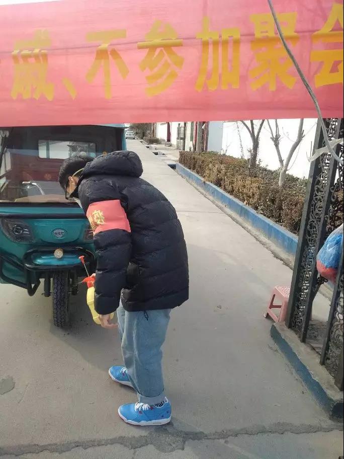 ( 党员王艺皓正在对出行车辆消毒)