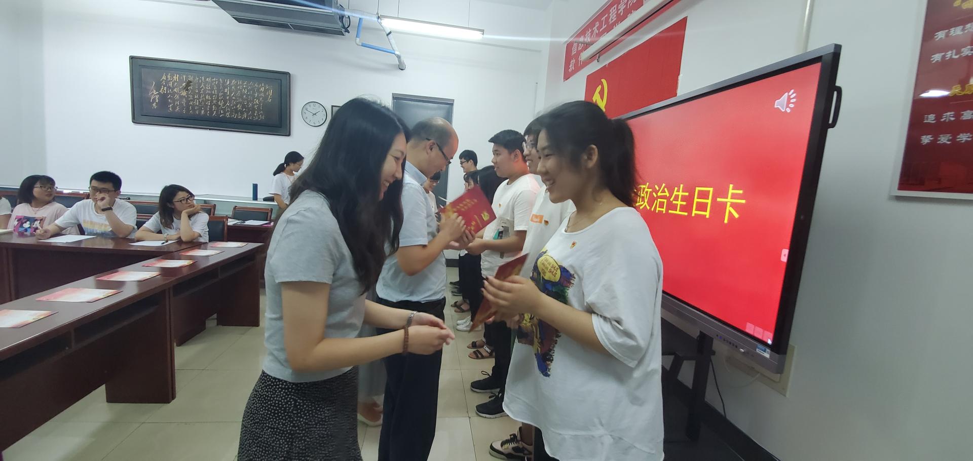 会议隆重而温馨。首先在团结友谊进行曲中向每一名毕业生党员颁发了政治生日卡。小小卡片,意义深远,里边记录了入党誓词,党员加入党组织的时间,同时也饱含着母校的嘱托与祝愿。每当打开它的时候,就会想起当年向党旗宣誓的情景,耳边就会响起铮铮誓言,就会回忆起在母校的美好时光。而牢记政治生日,不忘入党誓言,是对信仰和初心的坚守,是对使命和担当的承诺。通过这张小小卡片,鞭策和激励毕业生党员,要用坚定的信念守初心,用实际行动践誓言。