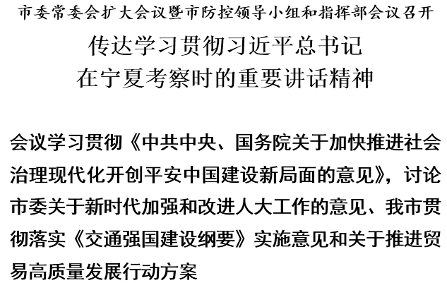 11日上午,市委常委会扩大会议暨市防控领导小组和指挥部会议召开,传达学习贯彻习近平总书记在宁夏考察时的重要讲话精神,研究我市贯彻落实措施。市委书记、市防控领导小组组长李鸿忠主持并讲话,市委副书记、市长、市防控指挥部总指挥张国清,市人大常委会主任段春华,市政协主席盛茂林,市委副书记阴和俊出席。