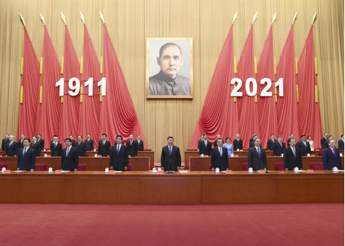 人民大会堂大礼堂气氛庄重热烈。主席台上方悬挂着“纪念辛亥革命110周年大会”会标,后幕正中是孙中山先生画像,10面红旗分列两侧,上面悬挂的“1911”“2021”字标格外醒目。