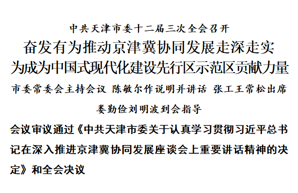 (来源:天津日报)5月31日,中国共产党天津市第十二届委员会第三次全体会议召开。全会坚持以习近平新时代中国特色社会主义思想为指导,全面贯彻落实党的二十大精神,认真学习贯彻习近平总书记在深入推进京津冀协同发展座谈会上的重要讲话精神,动员全市广大党员干部群众奋发有为推动京津冀协同发展走深走实,担当起使京津冀成为中国式现代化建设先行区、示范区的职责使命,不断开创全面建设社会主义现代化大都市新局面。